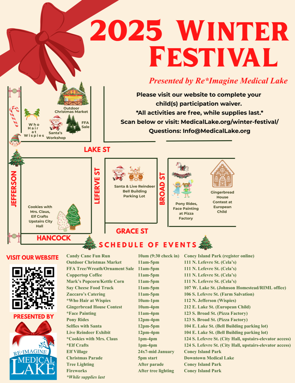 The Re*Imagine Medical Lake Winter Festival takes place on the second Saturday in December each year! This signature event features a wide range of attractions spread across Medical Lake that are assured to be fun for the entire family.